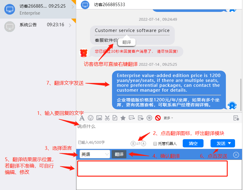 在接待不同語(yǔ)言的訪客時(shí),可將訪客消息及發(fā)送文字翻譯為指定語(yǔ)言,目前支持英、法、日、韓、俄等語(yǔ)言。